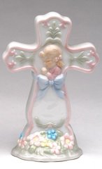 Elegant, stand-alone Shiny Porcelain Cross figurine with flowers, bow, praying girl. Size: 4 inches high. Read more...